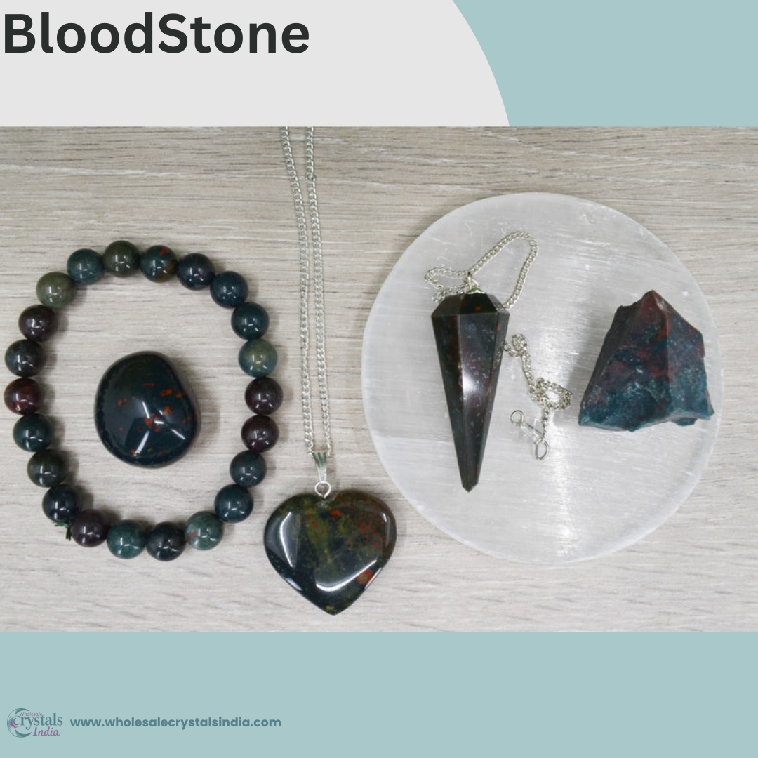 Blood Stone Crystal Combo Pack – Bracelet, Heart Pendant, Tumble, Raw Stone, Pendulum + Free Selenite Plate