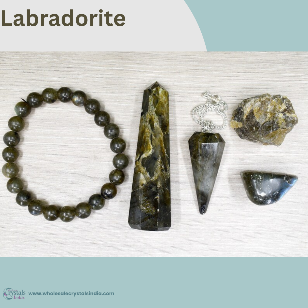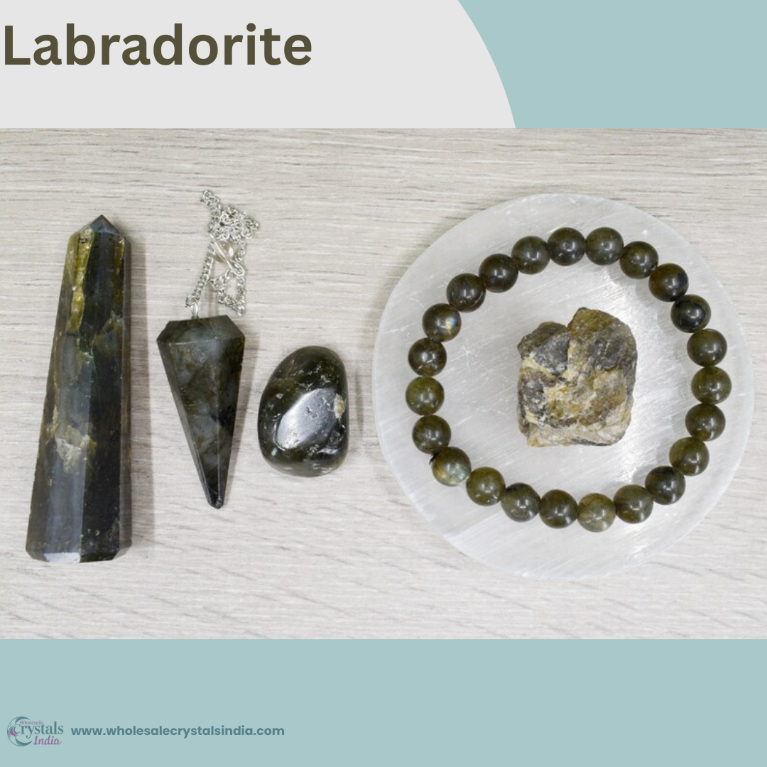 Labradorite Crystal Healing Set | 6+1 Combo with Bracelet, Pendant, Tower & Free Selenite Plate